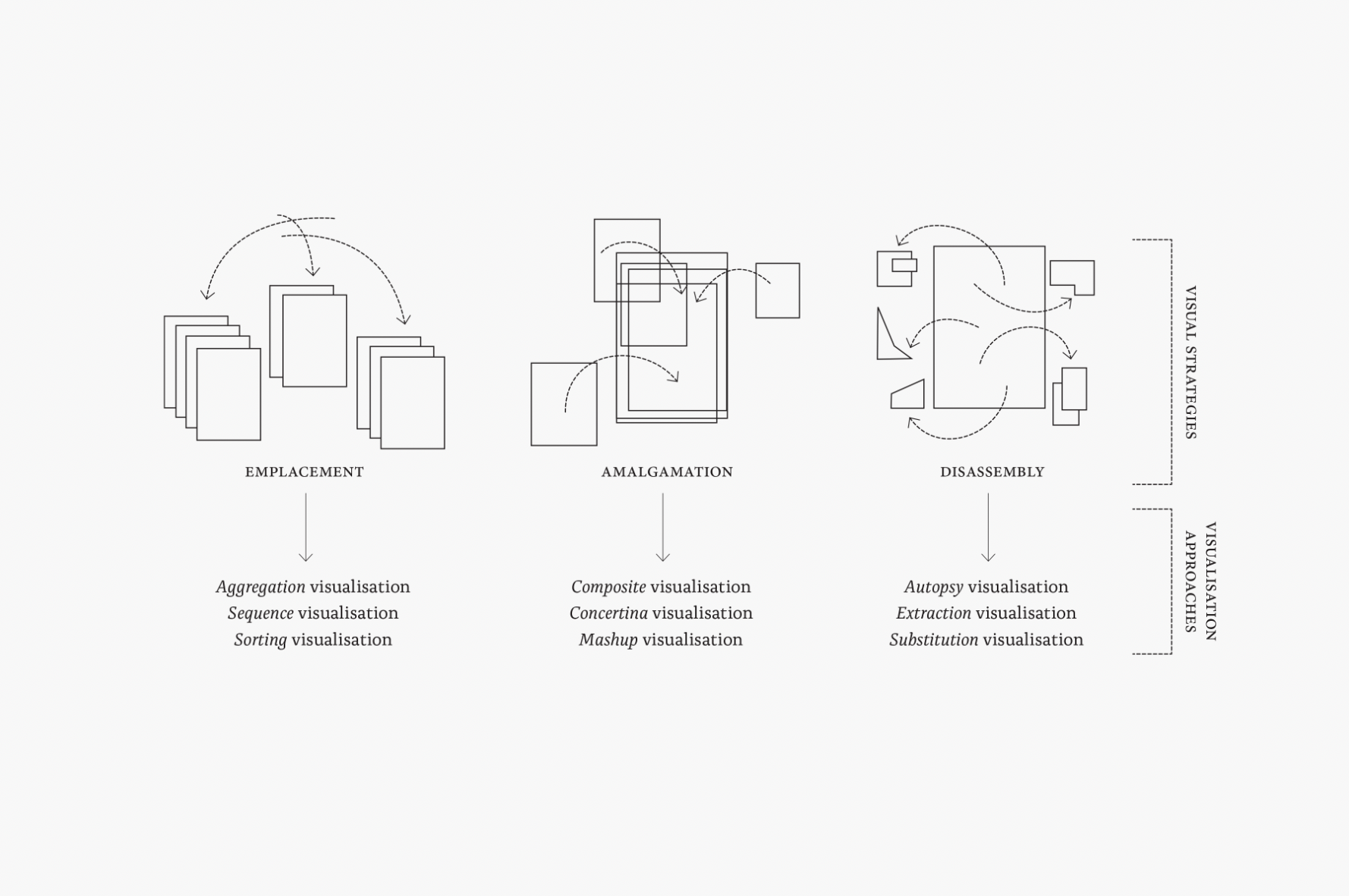 Designed to graphically express the three key strategies developed in the research to parse and analyse visual communication design artefacts and collections.