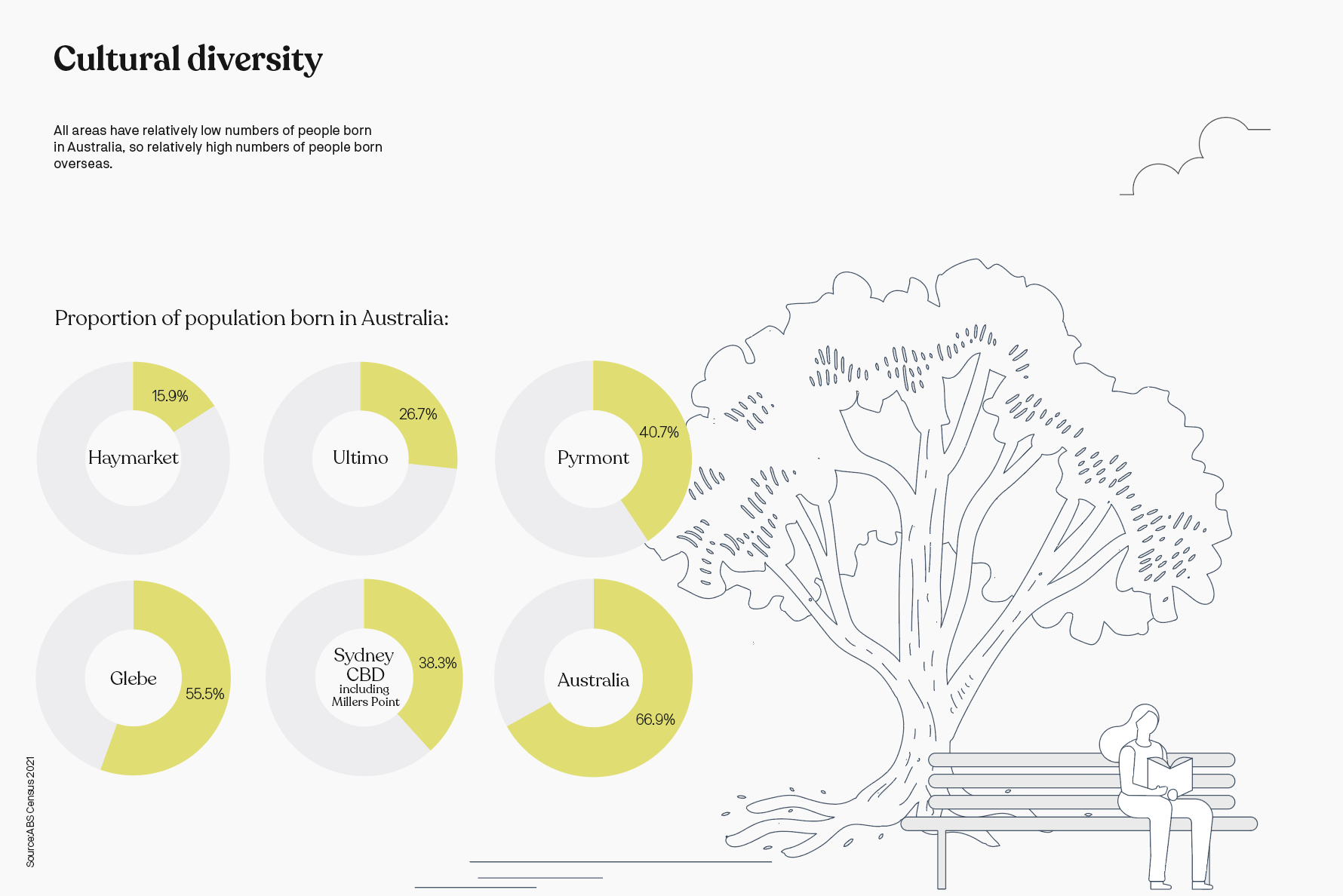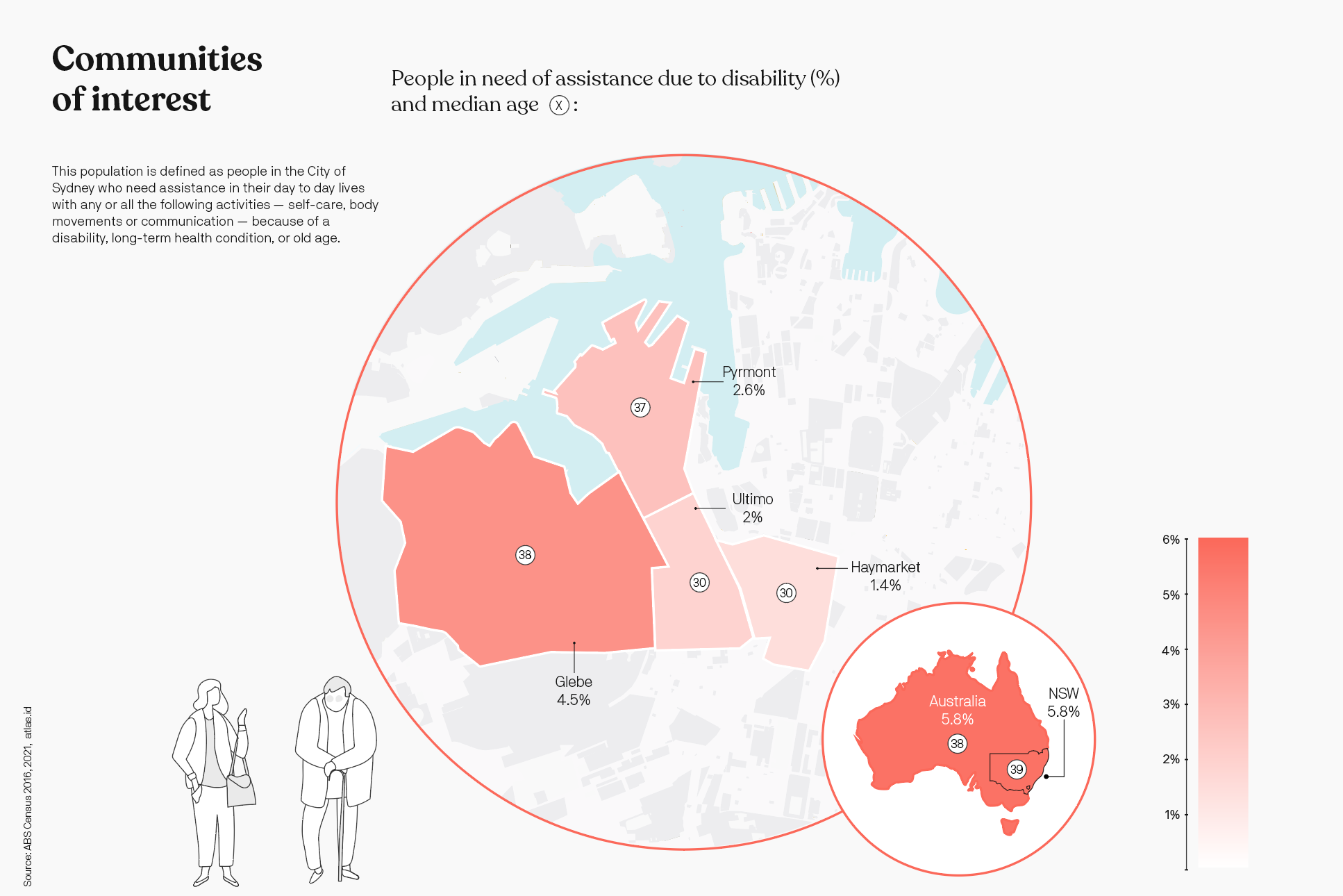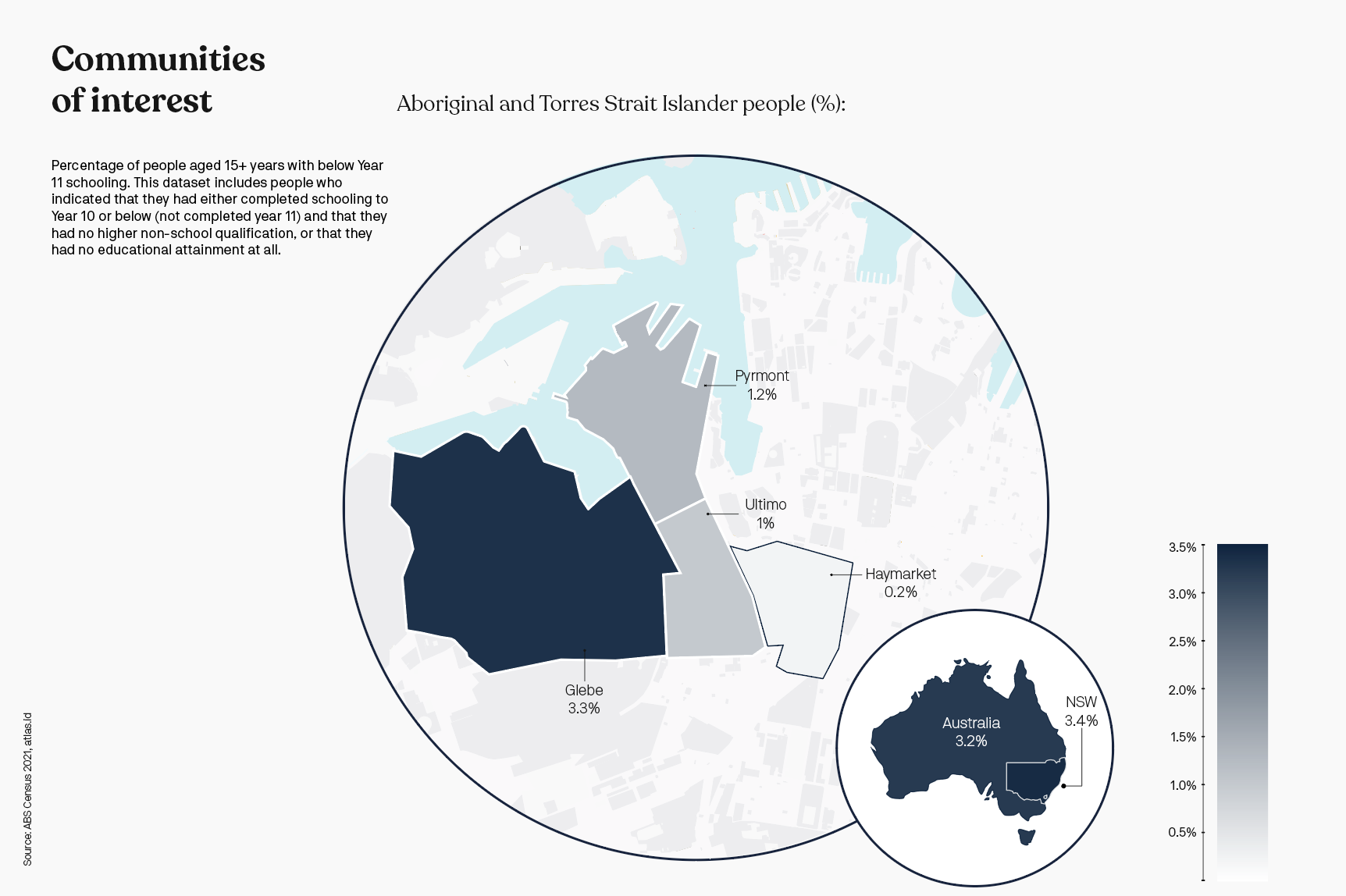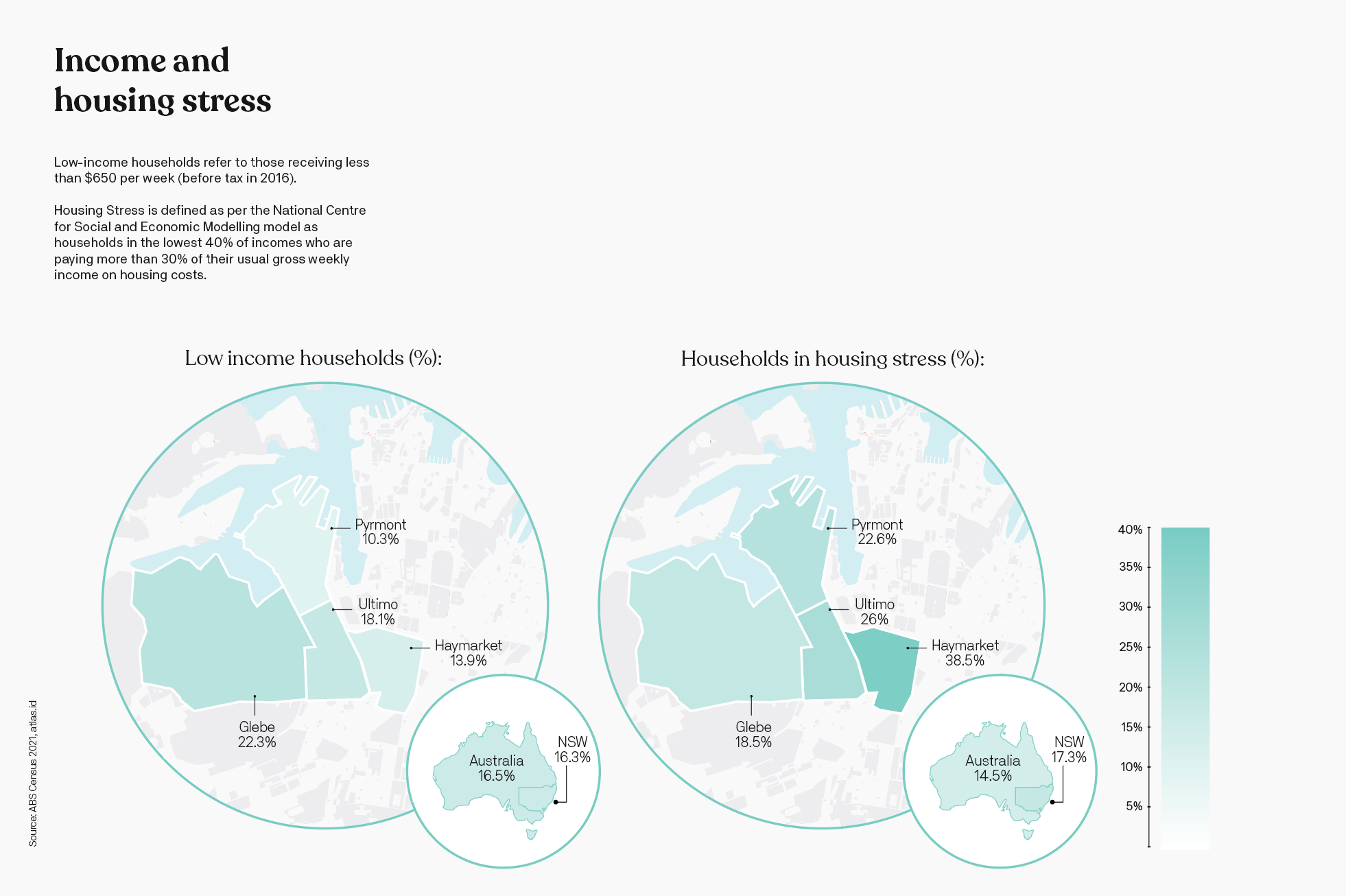 Comparative visualisations of demographic data for the Suburb Theory of Change project through the Centre for Social Justice and Inclusion at the University of Technology Sydney.