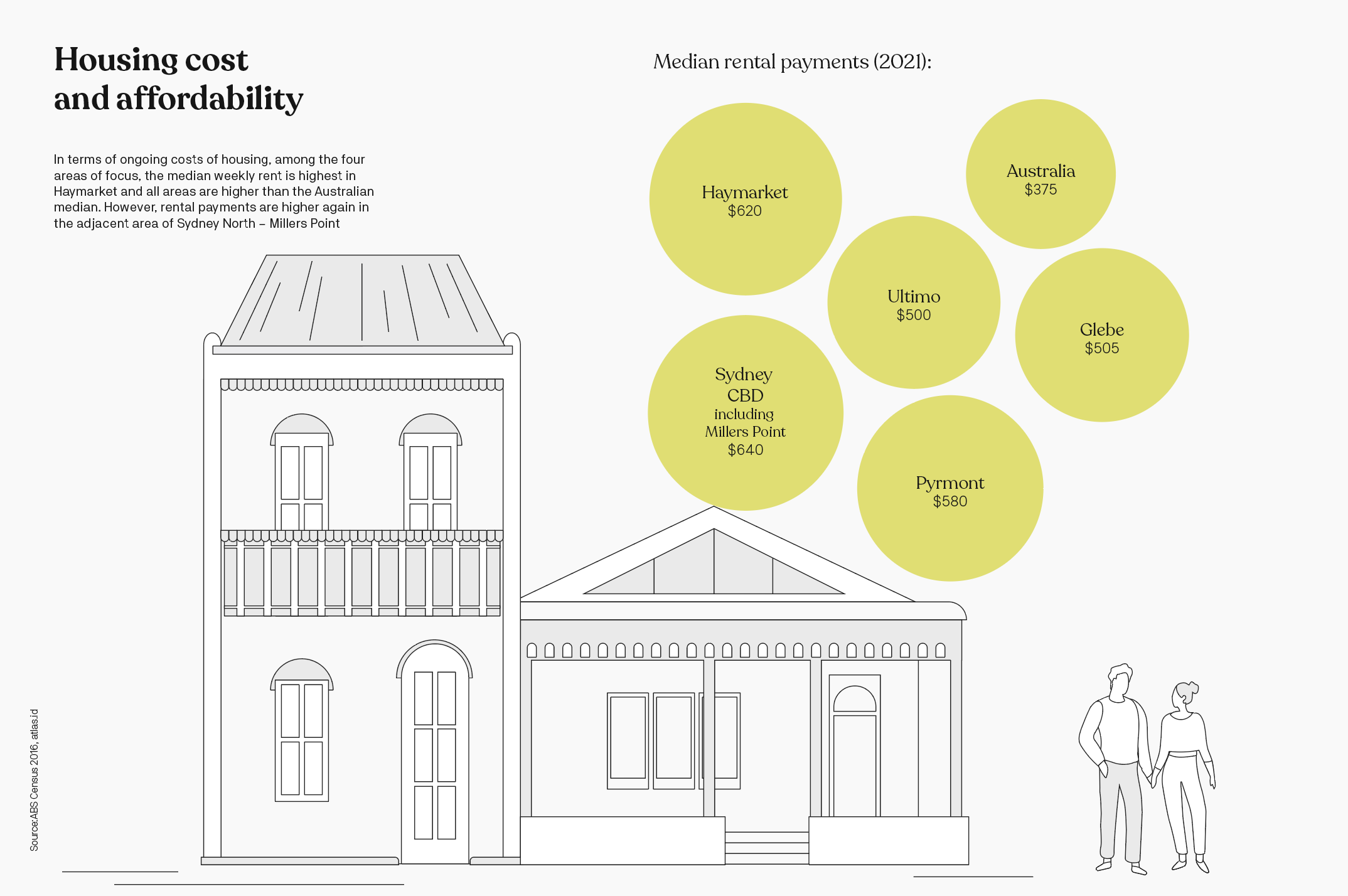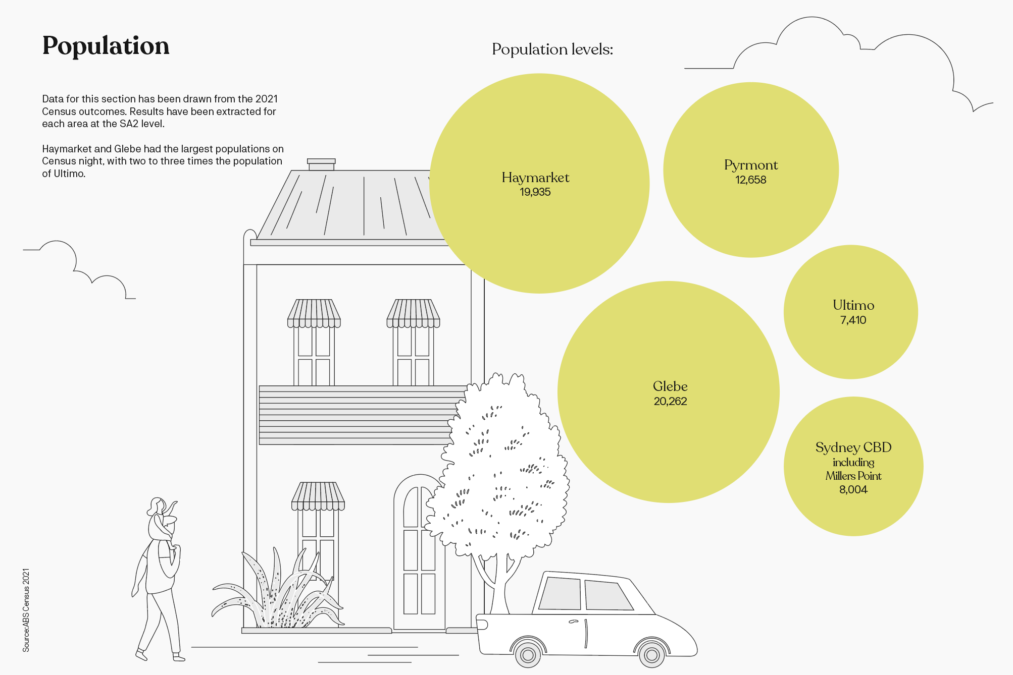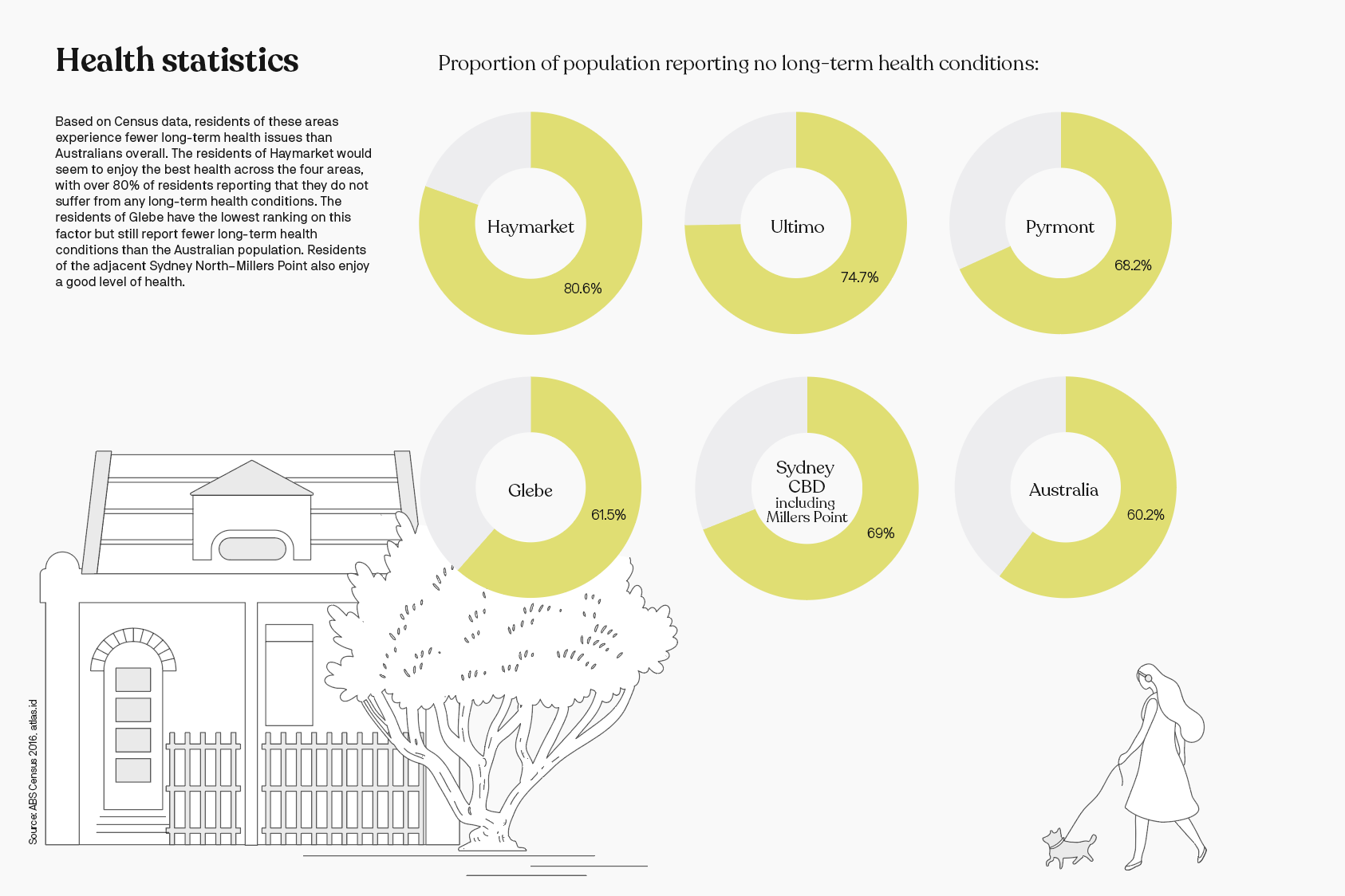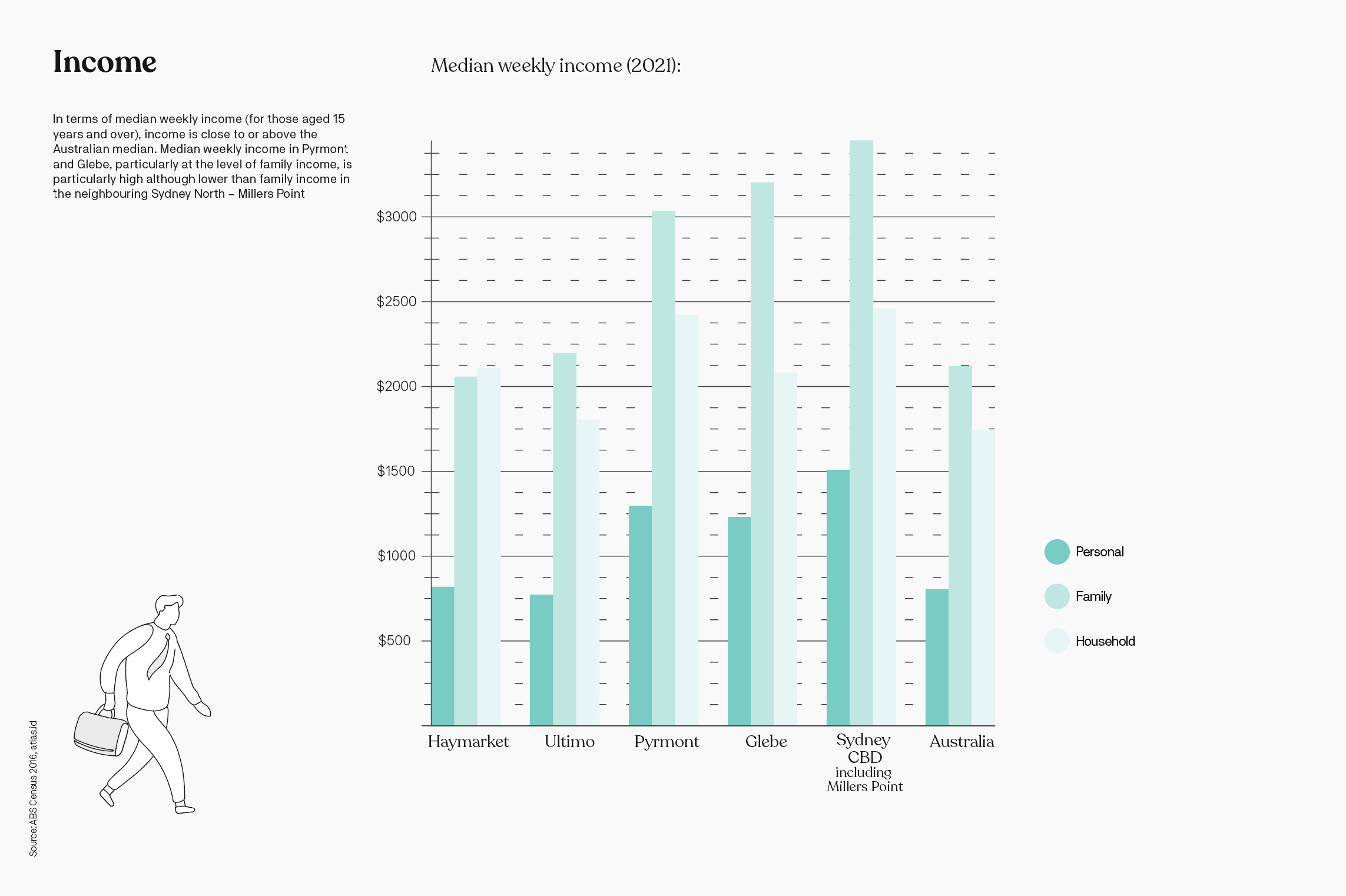 Comparative visualisations of demographic data for the Suburb Theory of Change project through the Centre for Social Justice and Inclusion at the University of Technology Sydney.